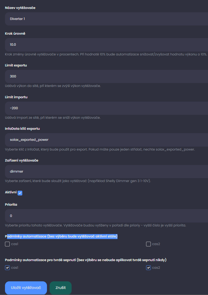 Dále si můžete nastavit prioritu a podmínky pro automatizaci. Pokud vyberete nějaké “podmínky automatizace”, pak bude vytěžovač aktivní pouze, když budou tyto podmínky platné. Dále máte možnost nastavit i podmínky pro tvrdé sepnutí. To znamená, že při splnění jedné z těchto podmínek dojde ke 100% otevření relé.